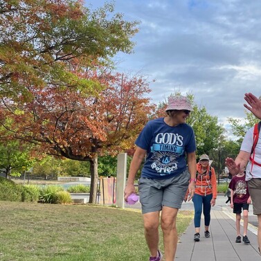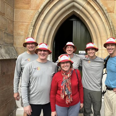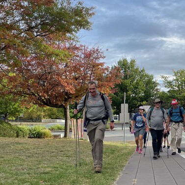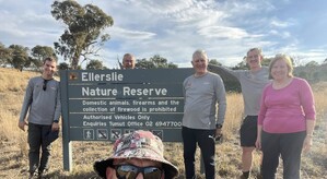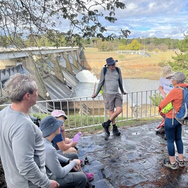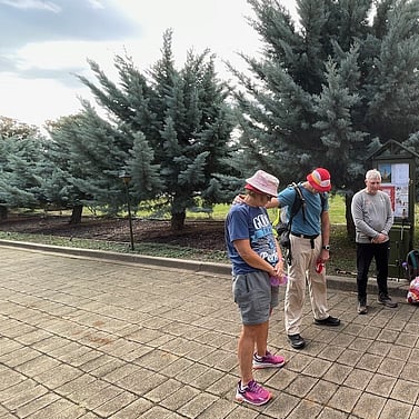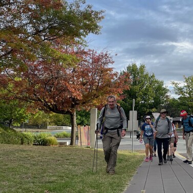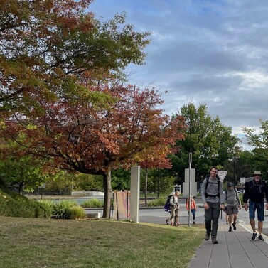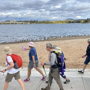 At Café 80/20, we gathered with family and friends—including Cam’s parents and Chris Mundy. After a warm lunch and heartfelt conversation, our group—now nine strong—followed the Bicentennial National Trail past Scrivener Dam and into the heart of Canberra, finishing at St John’s Church.